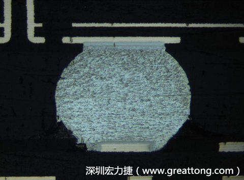 通常拿到一張BGA的切片照片時(shí),第一個(gè)要判斷的就是那一邊屬于BGA的封裝面,那一邊又是屬于電路板組裝面。對(duì)于這個(gè)問題,我的方法是從銅箔的厚度來做判斷,銅箔比較厚的那一面通常是電路板組裝面,因?yàn)锽GA封裝的載板通常都比電子組裝的電路板來得薄,所以會(huì)選用比較薄的銅箔厚度。