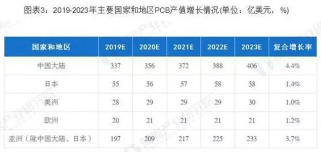 據(jù)Prismark預測,未來5年亞洲將繼續(xù)主導全球PCB市場的發(fā)展,而中國的核心地位更加穩(wěn)固,中國大陸地區(qū)PCB行業(yè)將保持4.4%的復合增長率,至2023年行業(yè)總產(chǎn)值將達到405.56億美元。在PCB公司"大型化、集中化"趨勢下,已較早確立領(lǐng)先優(yōu)勢的大型PCB公司將在未來全球市場競爭中取得較大優(yōu)勢。