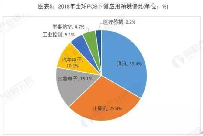 電子信息產(chǎn)業(yè)的蓬勃發(fā)展是PCB行業(yè)發(fā)展的重要助力。從下游應(yīng)用領(lǐng)域分布來看,2018年通訊行業(yè)的PCB市場規(guī)模最大,占比約為33.4%;其次是計算機行業(yè),占比約為29.4%。其他領(lǐng)域PCB市場規(guī)模較大的是消費電子、汽車電子。